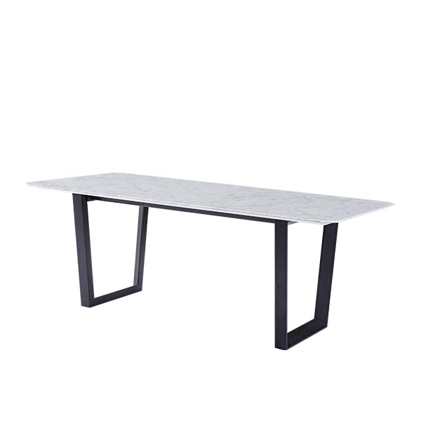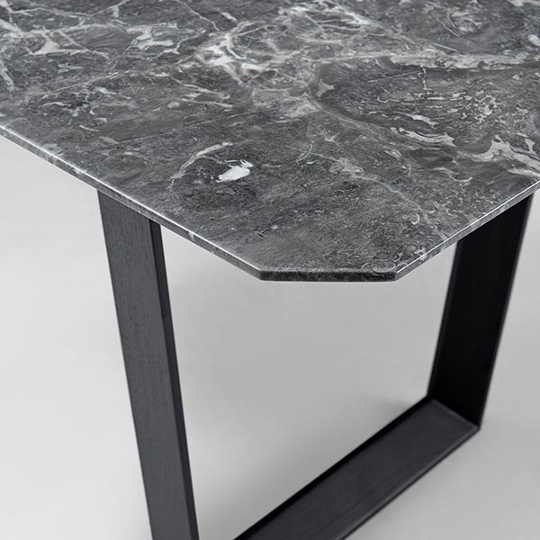 The four corners of the table top are cutting into obtuse angles, and the U-shaped solid wood legs are also bevel design. This way can make the wood legs flexible. The gray marble texture is three-dimensional, like an abstract ink painting. The size from 1.6 meters to 2 meters in length can meet different people’s needs. There are wood plates at the back of marble to support and reinforce structure.