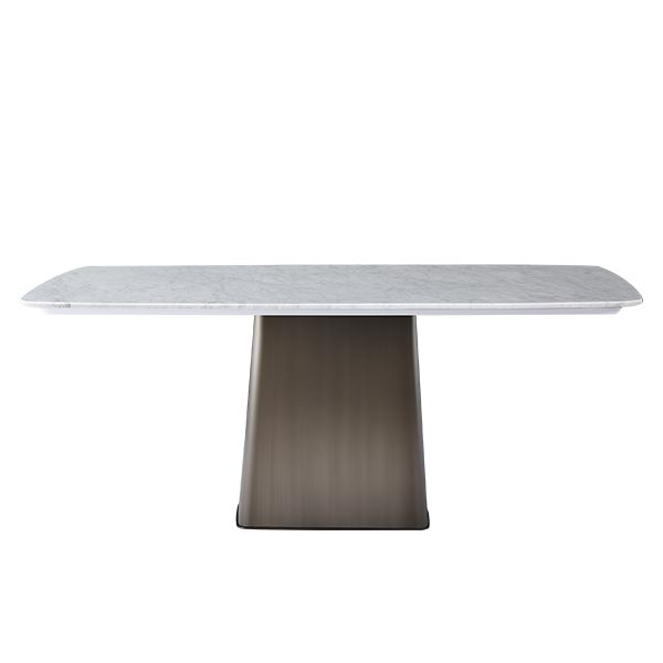 The trapezoidal stainless steel base is brushed with bronze, and the bottom is decorated with bronze brushed stainless steel sheets. The table top is white natural marble imported from Italy, with rounded corners and safe treatment. There is also wood board at the bottom to support and reinforce the structure.