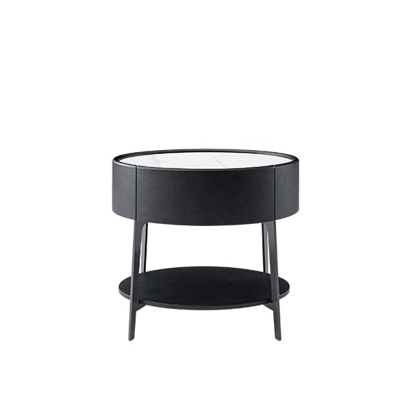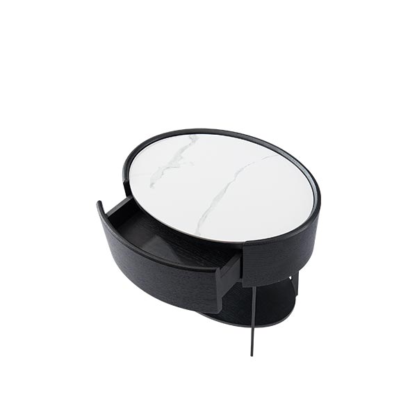 Oval shape is very good for nightstand. The oval pull-down extension is designed as a supporting plate, which is connected with the gray steel frame in a figure of eight to make the overall shape more complete. Kara white ceramic is embedded, wear and tear, the wood around the circle is slightly raised. And the three side oblique cutting shows the details of the process characteristics.