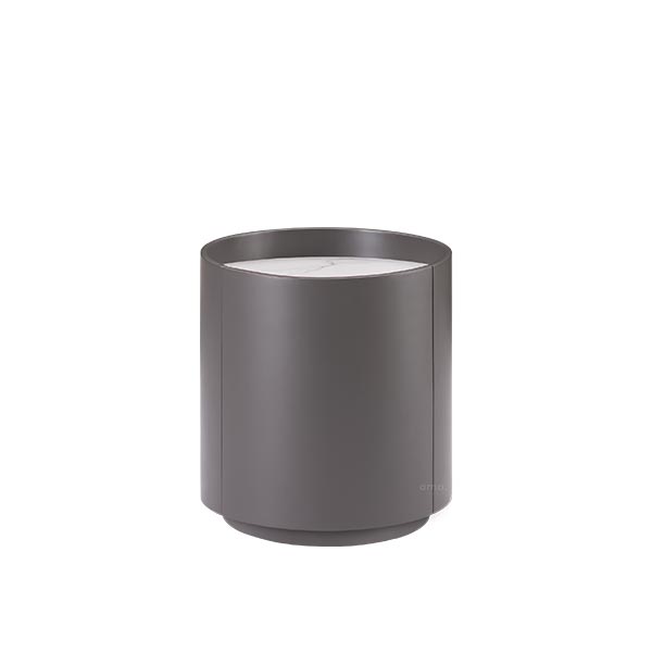 It is in the shape of a regular cylinder nightstand, the upper part is oblique cutting. And the Kara white ceramic is embedded.Let’s open the outer drawer, and there is a small drawer hidden inside. The reason for this design is that the cylinder shape won’t be damaged, and the overall design will be more concise. The built-in drawer can also be used to store sundries, improving practicality.